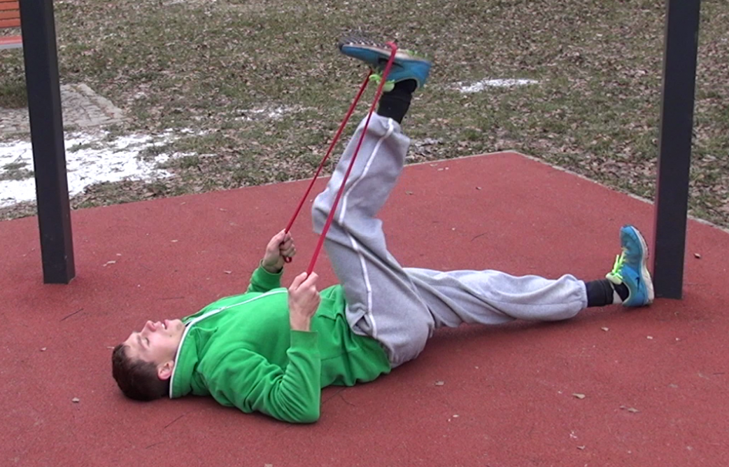 Lehněte si na záda, jednu (pravou) nohu natáhněte. Na druhou (pro nás levou, protahovanou) nohu uvažte gumu a gumu chytněte kousek nad smyčkou (pravou) rukou. (Levou) rukou uchopte gumu zevnitř na konci a veďte jí gumu za hlavou (s rukou nataženou či pokrčenou pod hlavou) pro vytvoření stabilnější páky. Hlavu můžete volně položit na gumu, musí to pro vaši krční páteř být pohodlné. (Levou) rukou poté stahujte pomocí gumy nohu svisle dolů směrem k rameni.