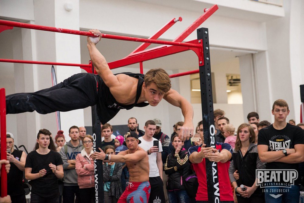 Můj warm up je pro mě základ tréninku, bez kterého se neobejdu. Začínám rollováním na masážním válci, pak následuje dynamický strečink, zahřátí a aktivace kloubních pouzder. Poté vždy využívám lehčí odporovou gumu, se kterou protahuji a zároveň zvyšuji kontrakci a prokrvení svalů. Můj warm up trvá zhruba 15-20 min a zaměřuji se na ramena a zápěstí. Především ramena považuji za nejdůležitější partii ve street workoutu, na které stojí plno cviků a která se nejčastěji zraňují. Tohle vše zakončuji visem na hrazdě, několika přítahy a kliky na zemi. Pokud se chystám cvičit i nohy, tak pro lepší mobilitu krátce protáhnu i je. Po skončení tréninku se vrhám na statický strečink a protažení jednotlivých partie až do pocitu uvolnění. Nakonec využívám masážní válec, kdy rolluji spíše pomaleji a důsledněji. Do toho všeho zařazuji i ledové sprchy, a to po celý rok. Někdy i po tréninku, ale spíše po ránu, kdy dokáží krásně probudit a člověk se cítí dost fresh. Většinou trénuji večer, takže po tréninku studenou sprchu nedávám, protože to není nejvhodnější před spaním, kdy by mělo tělo spíše být uvolněno teplem a uvedeno do klidu. Osobně si myslím, že studené sprchy nějak extra zvlášť nezlepšují regeneraci, spíše imunitu a odolnost vůči teplotním změnám. Nepatřím mezi ty, kterým stačí trochu vyklepat ruce a jsou připraveni na trénink. Bez strečinku jsem jako dřevo, řekl bych dokonce, že je u mě warm up tak 50 % úspěchu. Především se chci vyvarovat zranění, zlepšit výkon a regeneraci.