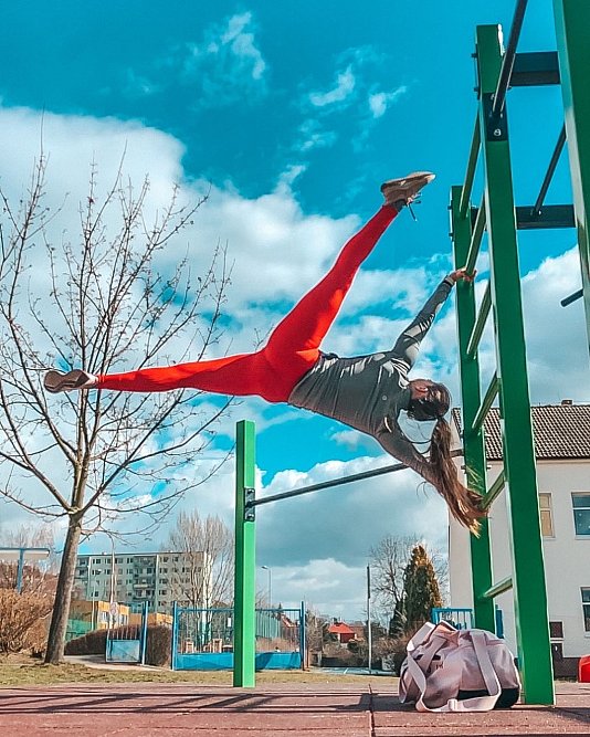 Předtím, než do human flagu skočíš po hlavě by to chtělo mít vybudovaný nějaký ten solidní základ. Optimální by mělo být zvládnutí alespoň takových 15-ti striktních shybů na hrazdě a třeba i 30-ti vteřinová výdrž v L-situ. Prvním krokem, který je potom potřeba trénovat je výdrž v horní pozici vlajky. Zapomeň tedy na nějaké vyskakování ze země a čekání na to, jestli se tentokrát už náhodou udržíš v horizontální pozici. Raději nejprve pevně uchop špricle žebřin, ideálně ve výšši tvých očí a v úrovni kolen a odrazem od země se dostaň do svislé pozice.