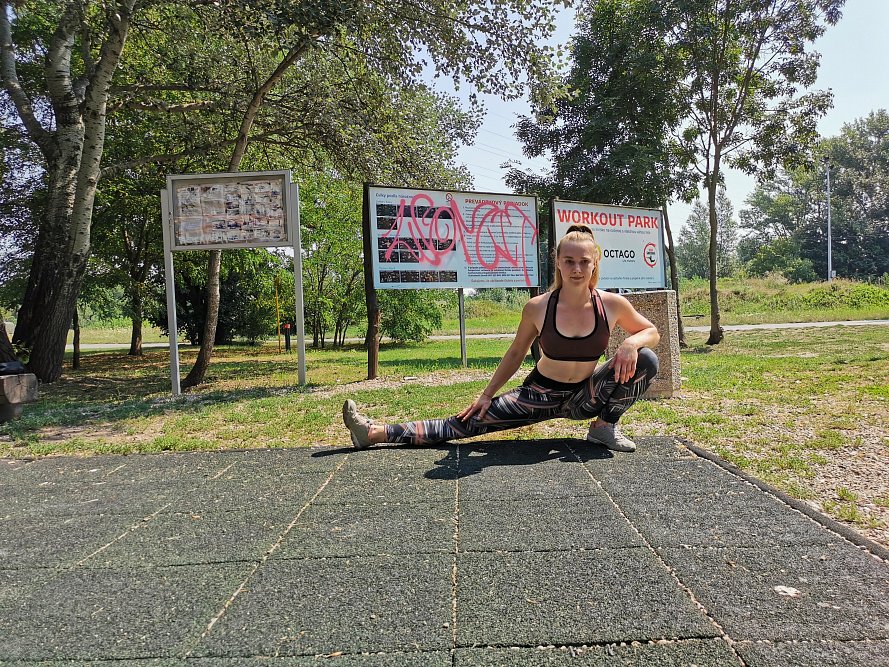 Cvičenia na bedrá: Sadneme si do pozície, do ktorej sa dostaneme aj z učupenia. Jedna noha smeruje do vnútornej, druhá do vonkajšej strany, pričom obe sú ohnuté v kolene. Panvu tlačíme vpred, vnútornú stranu stehna pritlačíme k zemi. V tejto pozícii sa vieme aj hrať a ,,hýbať", v polohe nemusíme striktne držať. Vieme sa napríklad ľahko presunúť do druhej strany a pouvoľňovať bedrové kĺby.